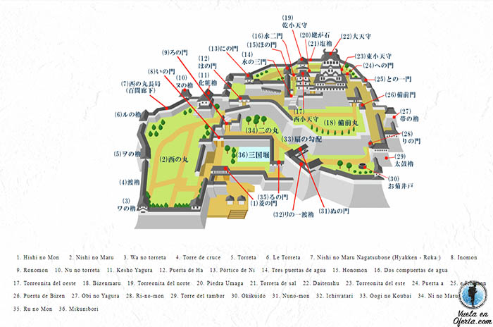 Siguiendo este enlace: Audioguía del Castillo de Himeji (oficial) abrirás un mapa con el que, a través de tu teléfono móvil y geolocalizando tu posición, podrás clicar sobre los diferentes elementos de interés para obtener información.